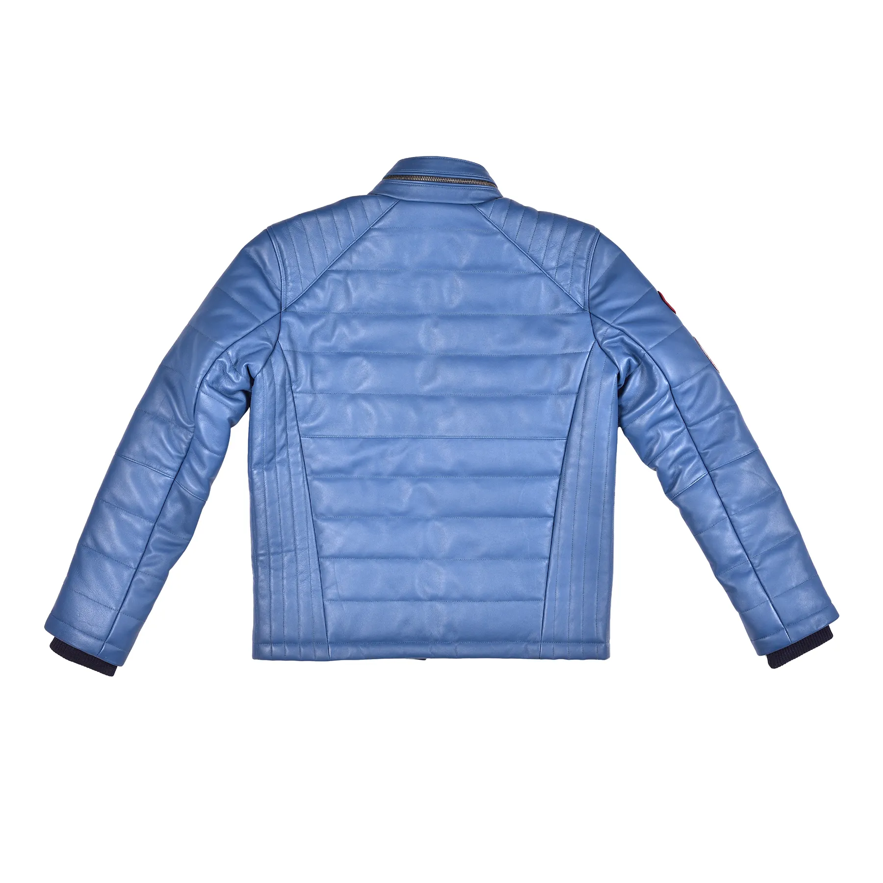 Crafted from premium, supple leather in a striking horizon blue, this jacket reimagines the classic puffer silhouette through a high-performance lens.