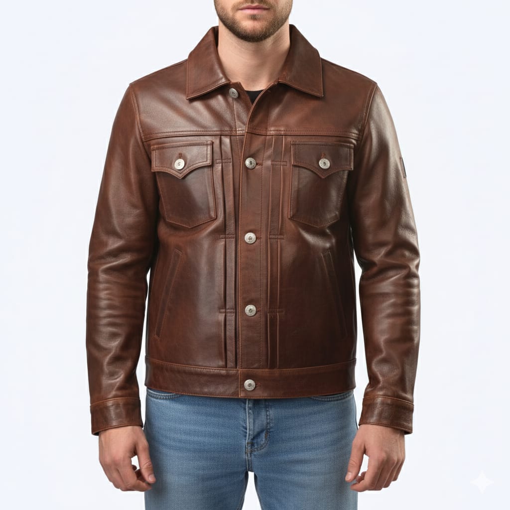 Brown leather trucker jacket is a unique design mixed with the cowboy style. However our jacket consists of some unique features. The jacket has a rugged style that suits every modern man. The chocolate brown touch in the color complements any outfit you choose. The selection of the premium leather hides for construction of this jacket and craftsmen ensures long-term durability. The jacket fits in naturally and it’s leather softens with every single wear. It creates a unique patina over years. The leather we have used for this outstanding piece is extracted from cow skin. So it is rough and tough and can be used throughout the year. Therefore the cow leather ages perfectly and gives an antique look.