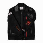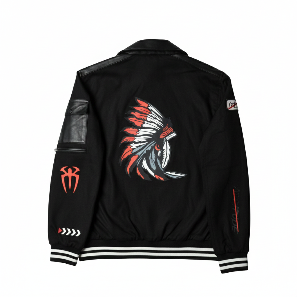 This stylish and bold jacket features a striking tribal warrior design on the back. The jacket is primarily black in color with black leather accents and details. The main design element is a large, colorful Native American-inspired headdress graphic in shades of red, black, and white.