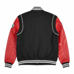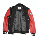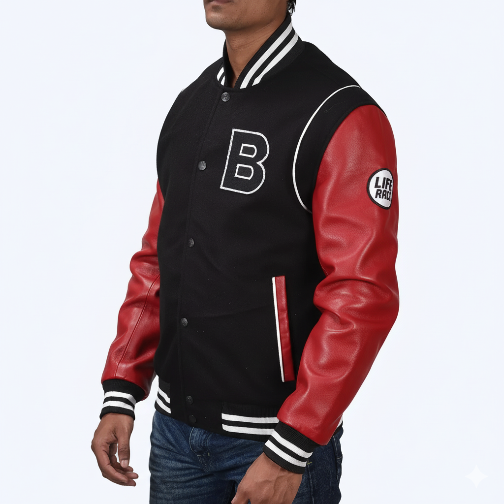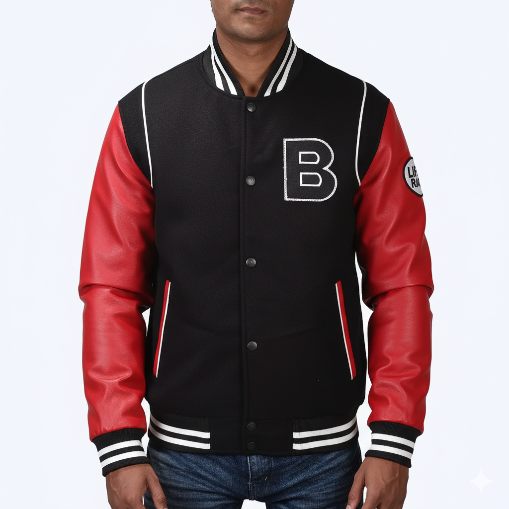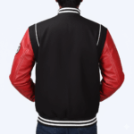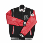 The jacket features a black body with contrasting white stripes on the collar, cuffs, and hem. The front has a large letter “B” patch on it, likely representing the brand or design. The sleeves are made of a sleek, red leather adding a touch of edginess to the overall look with a wool body.